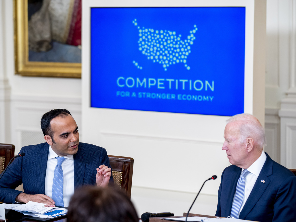 Consumer Financial Protection Bureau director Rohit Chopra, left, accompanied by President Joe Biden, right, speaks at a meeting with his Competition Council on the economy and prices in the East Room of the White House in Washington, Wednesday, Feb. 1, 2023.