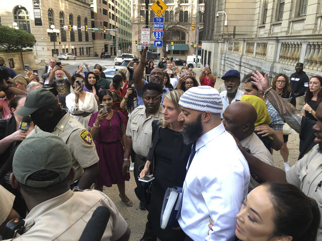 Adnan Syed, center, leaves the Cummings Courthouse, Monday, Sept. 19, 2022, in Baltimore. A judge has ordered the release of Syed after overturning his conviction for a 1999 murder that was chronicled in the hit podcast "Serial." (AP Photo/Brian Witte)