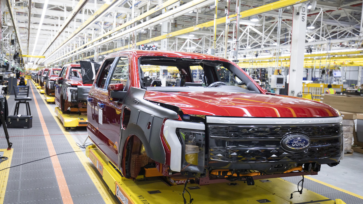Ford F-150 Lightning pickup trucks sit on the production line at the Ford Rouge Electric Vehicle Center on April 26, 2022 in Dearborn, Michigan.