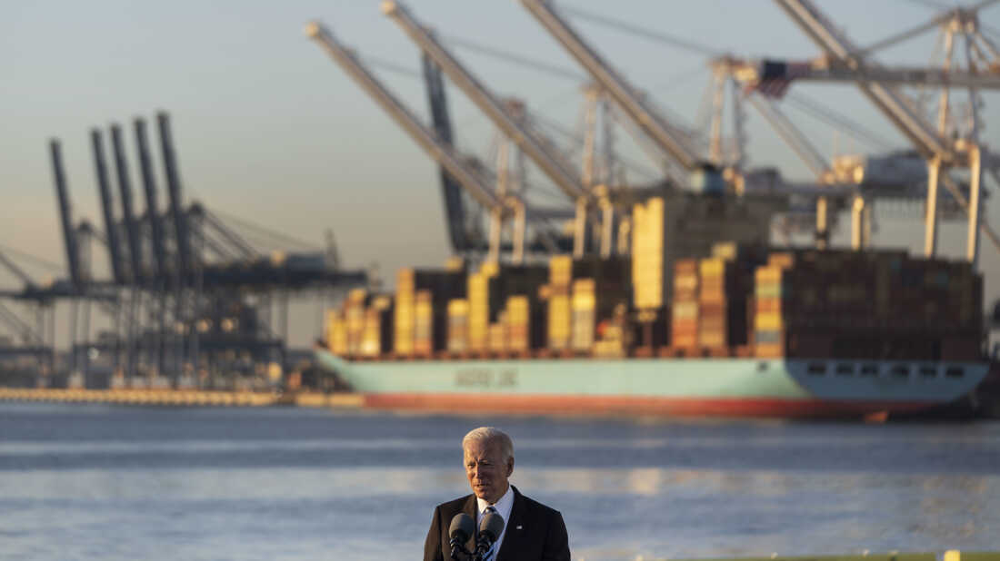 President Joe Biden speaks about the recently passed $1.2 trillion Infrastructure Investment and Jobs Act at the Port of Baltimore on November 10, 2021 in Baltimore, Maryland. Drew Angerer/Getty Images hide caption