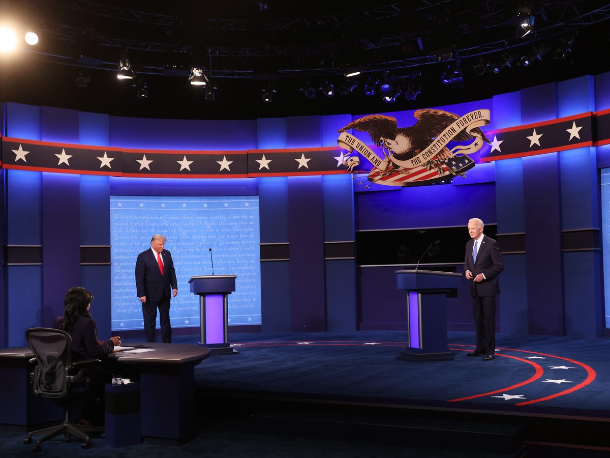 Former President Donald Trump Joe Biden take the stage for the final 2020 presidential debate in Nashville, Tennessee. So far, this election season Trump has refused to participate in any debates, and it's unclear whether there will be general election debates in the fall. Justin Sullivan/Getty Images hide caption