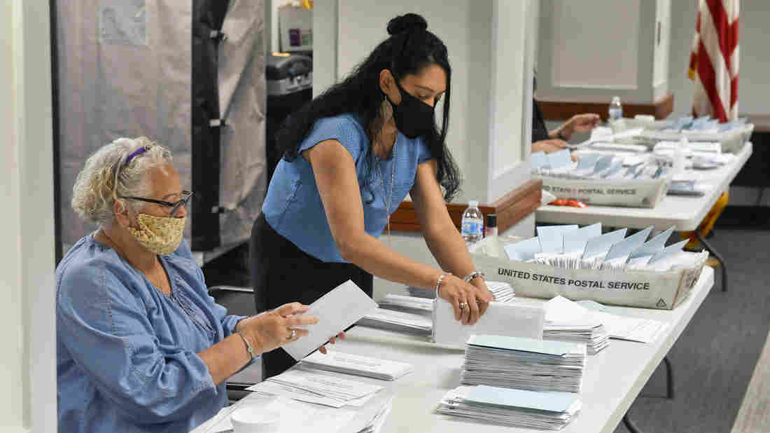 Workers sort through mail-in ballots in Reading, PA. Ben Hasty/MediaNews Group via Getty Images hide caption