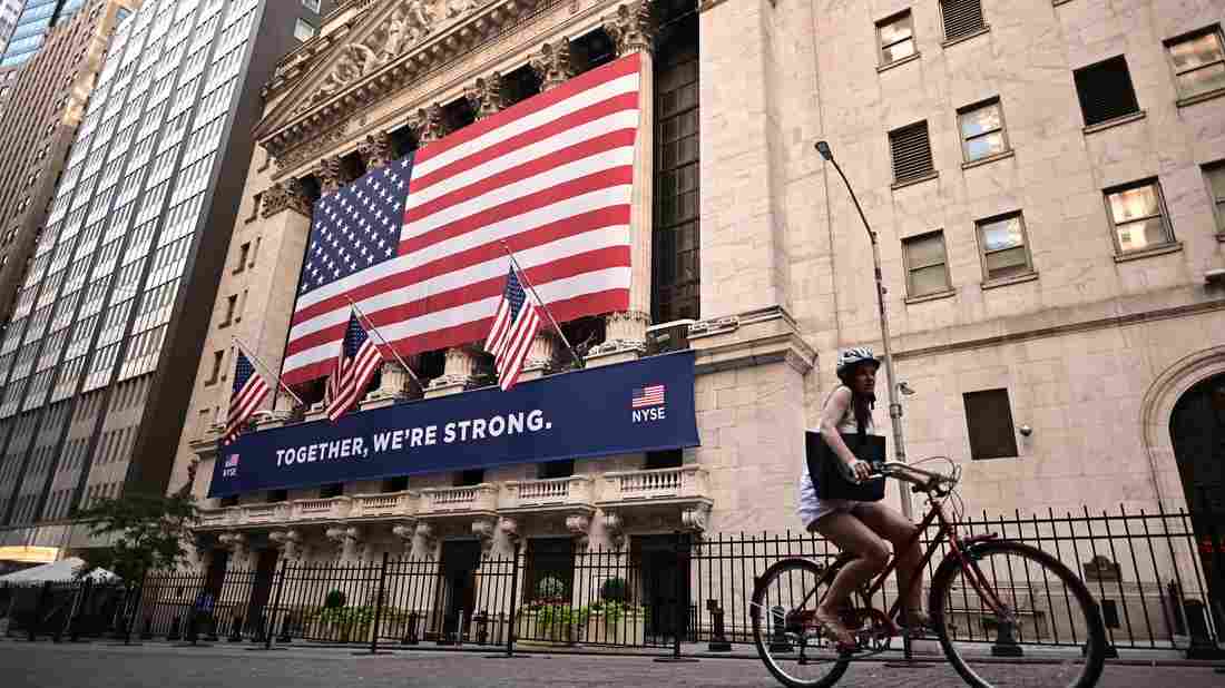 A woman rides past the New York Stock Exchange on July 13 at Wall Street in New York City.