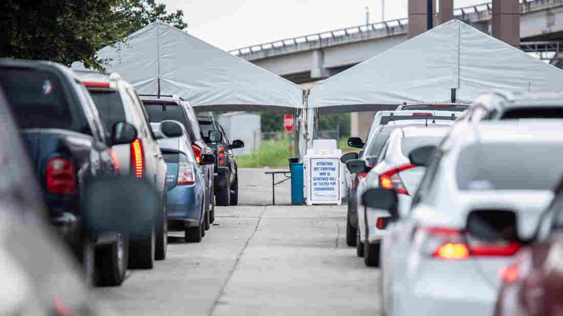People sit in their cars and wait in line at a COVID19 testing center on July 7 in Austin,