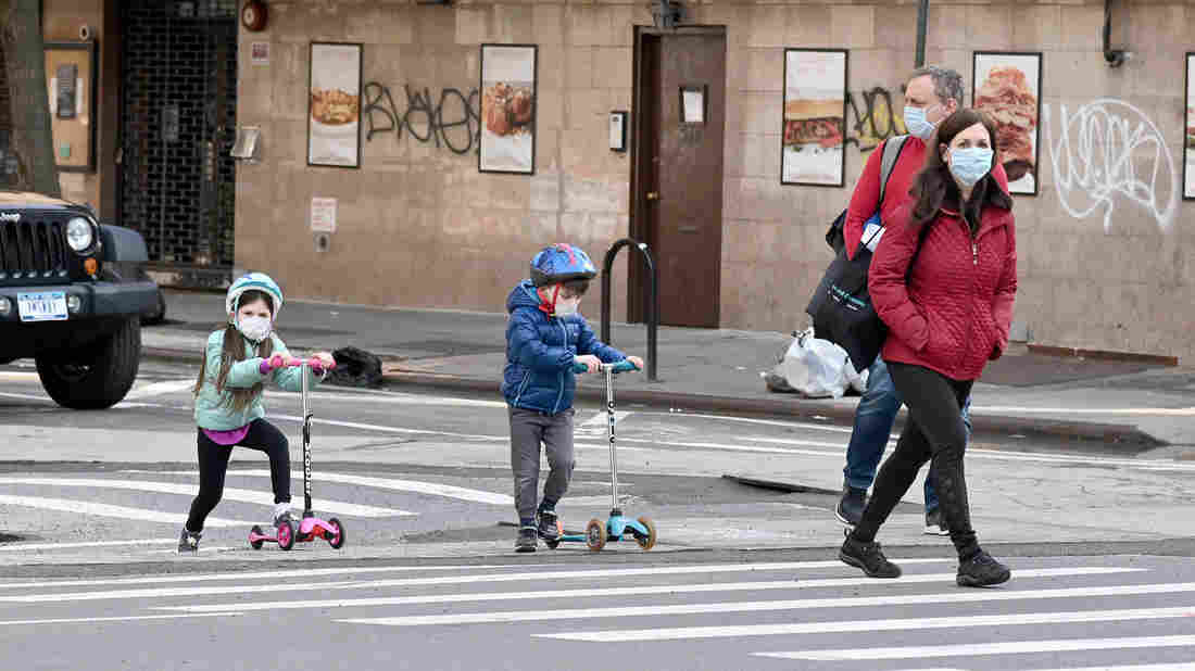NEW YORK, NY - APRIL 25: Children wearing face masks play on their scooters while their parents watch during