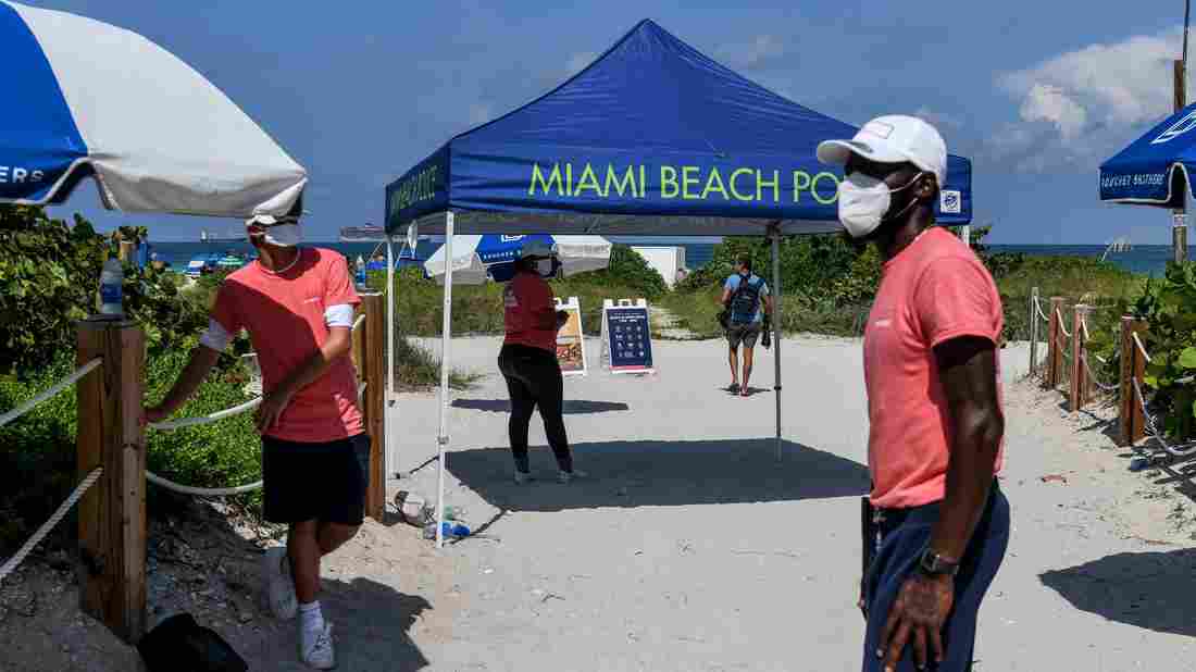 "Social distancing ambassadors" (in pink) stand at the entrance to Miami Beach, Florida, on June 10. The beaches of