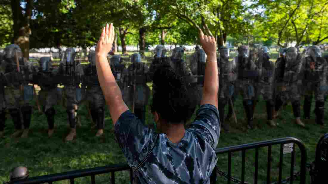 A protestor raises her hands near a line of National Guard soldiers deployed near the White House on June