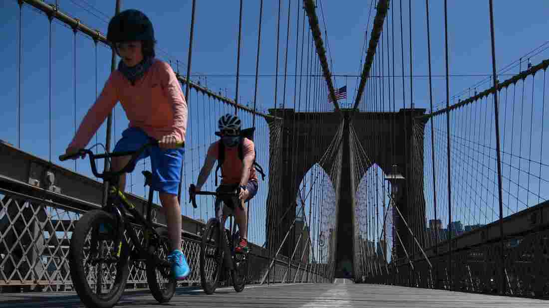 People ride their bikes on the Brooklyn Bridge, amid the coronavirus pandemic, on May 26 in New York City.
