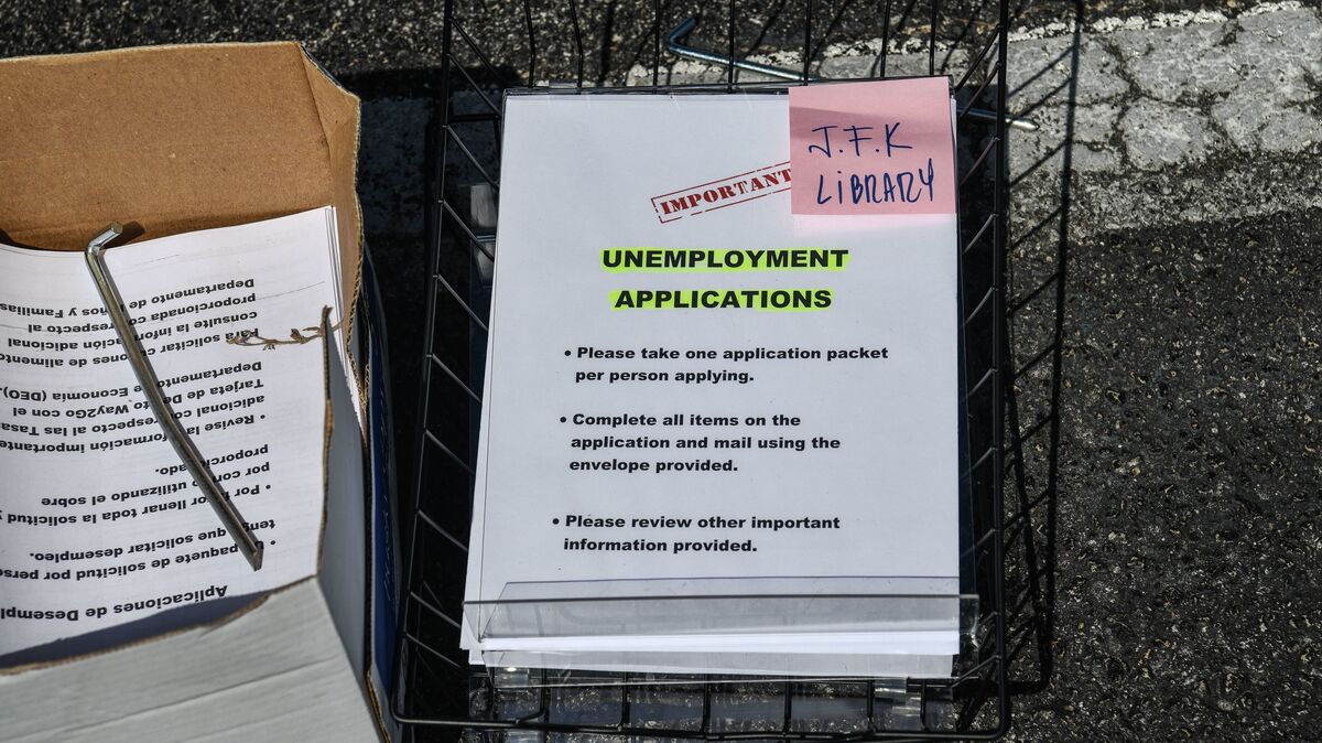 Unemployment forms are seen kept at a drive-through collection point outside John F. Kennedy Library in Hialeah, Fla. Chandan
