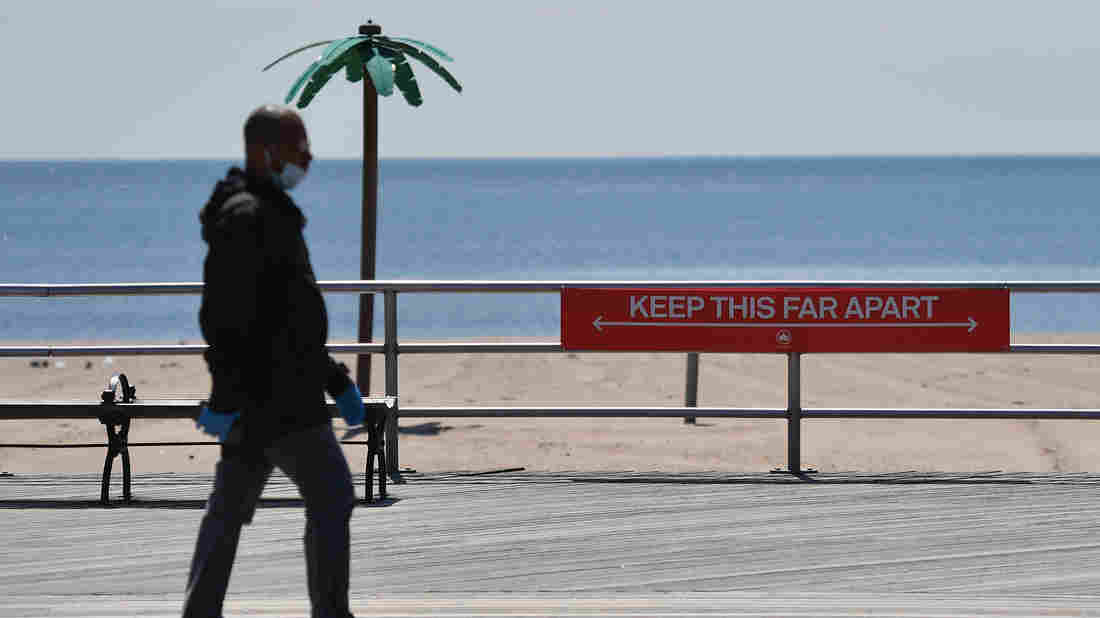 A sign reading 'Keep This Far Apart', reminds people of social distancing on the Coney Island boardwalk in New York