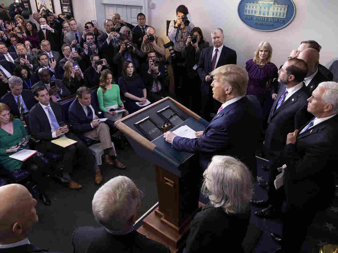 Then-President Trump speaks at the beginning of a news conference with members of the