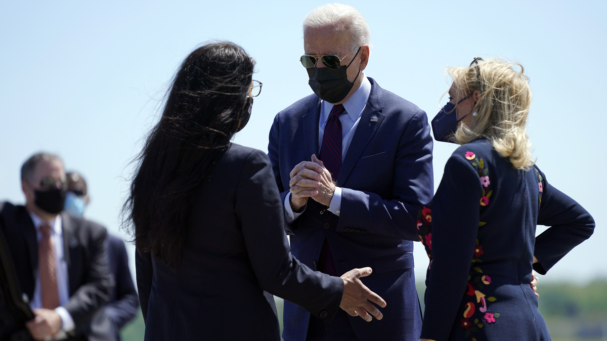 President Biden speaks with Reps. Rashida Tlaib (left) and Debbie Dingell on Tuesday after