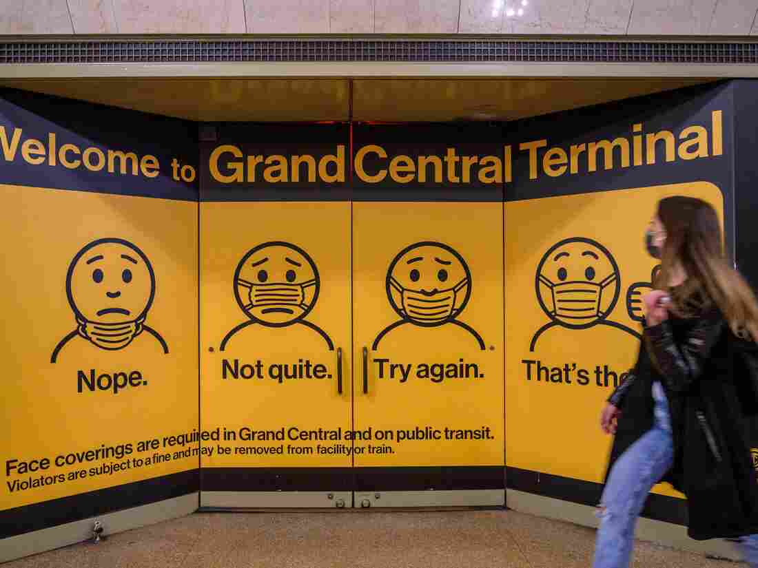 A woman walks past posters explaining mask requirements at Grand Central Terminal train station