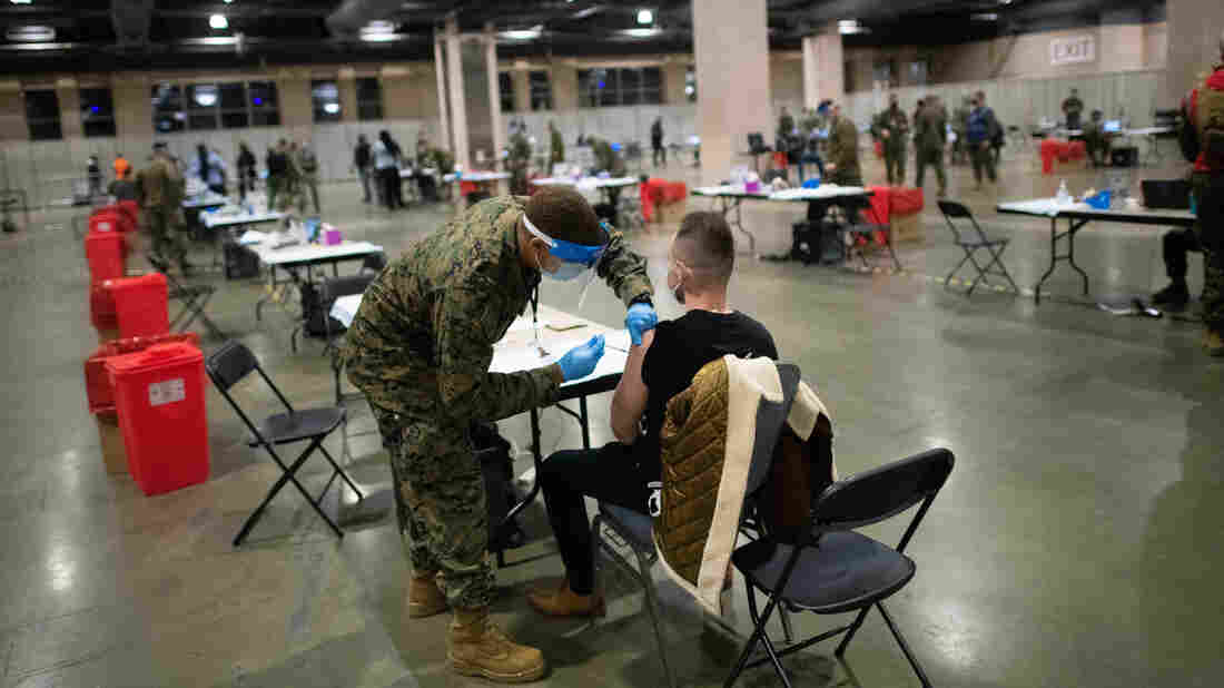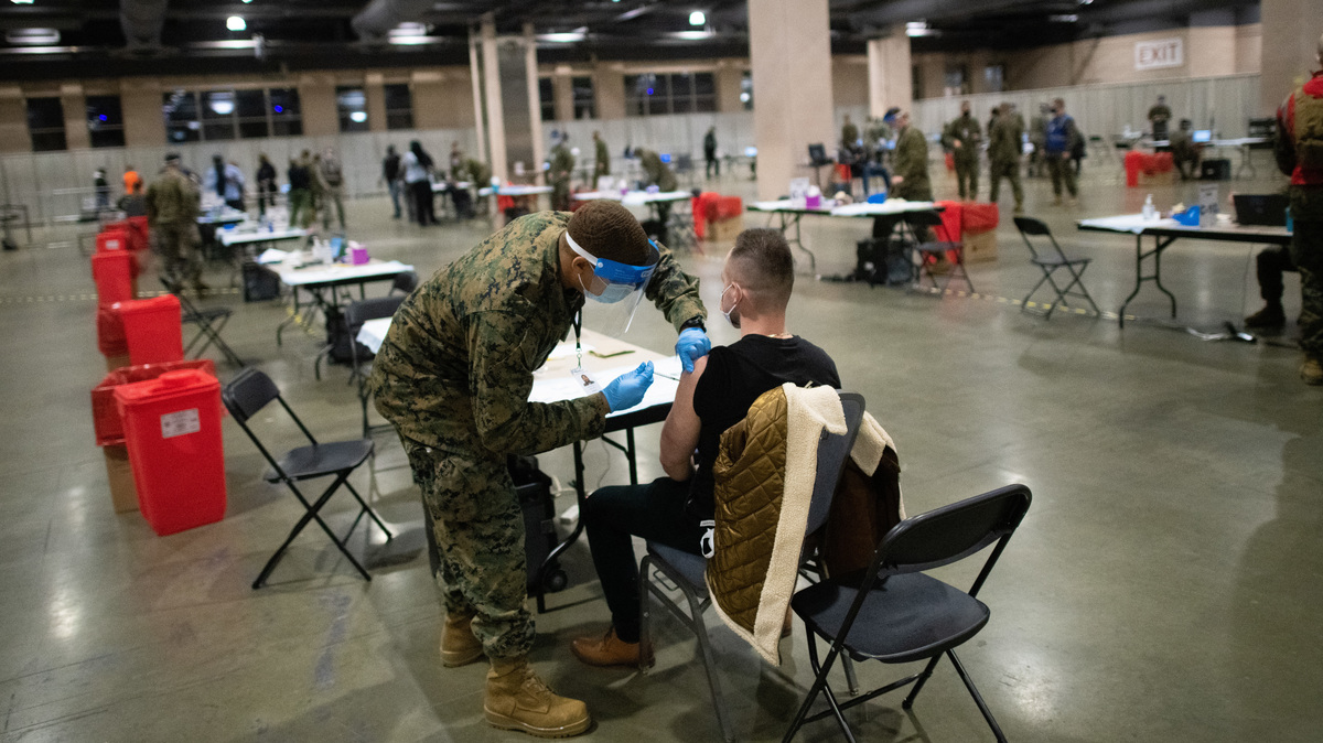 A member of the U.S. Armed Forces administers a COVID-19 vaccine at a FEMA
