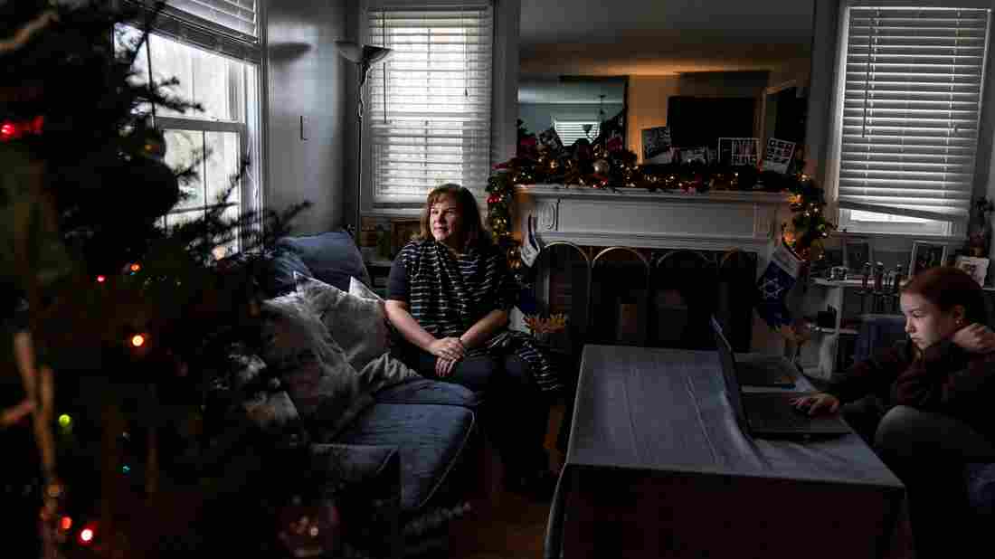 Eileen Carroll, left, sits for a portrait as her daughter, Lily, 11, attends school remotely from their home in