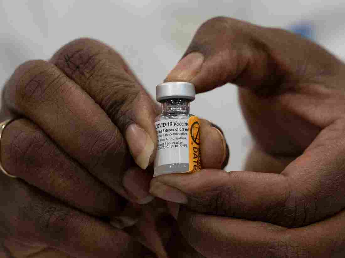Dr. Michelle Chester holds a vial of the COVID-19 vaccine at Long Island Jewish Medical Center on Monday. The