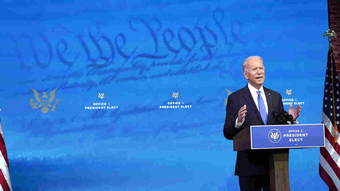 President-elect Joe Biden speaks about the Electoral College vote certification process on Monday in Wilmington, Del. Drew Angerer/Getty