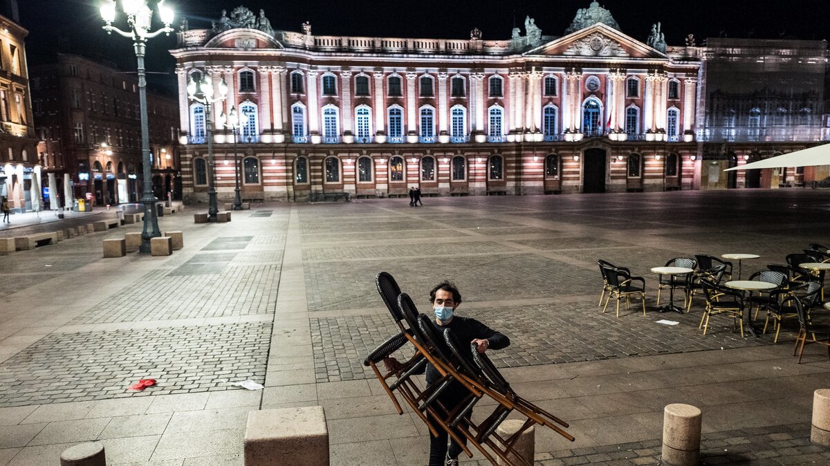 An employee takes a pile of chairs inside a closing bar on the Place du Capitole in Toulouse, France
