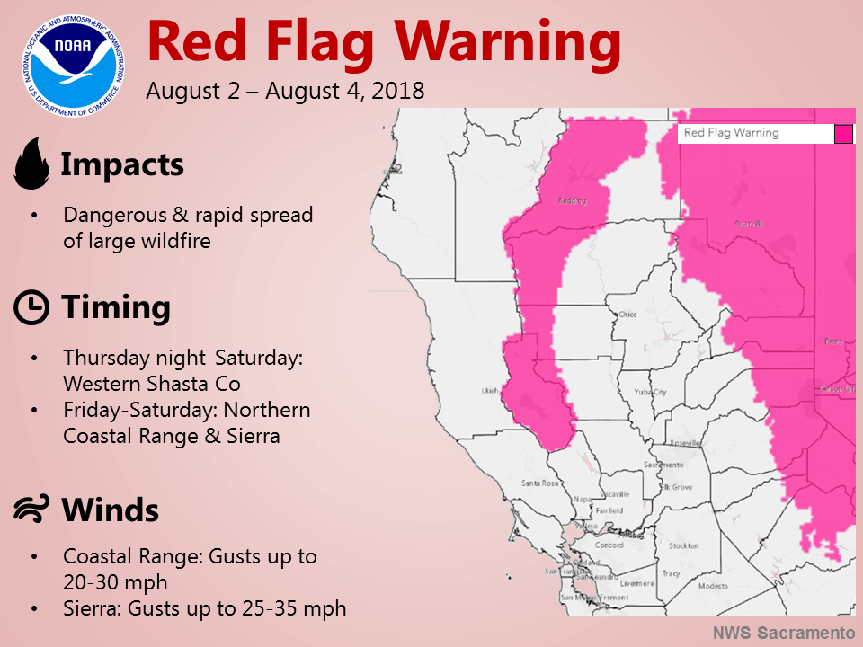 The National Weather Service in Sacramento has issued a Red Flag Warning, which is in effect from 11:000 am Friday to 11:00 pm PDT Saturday.
