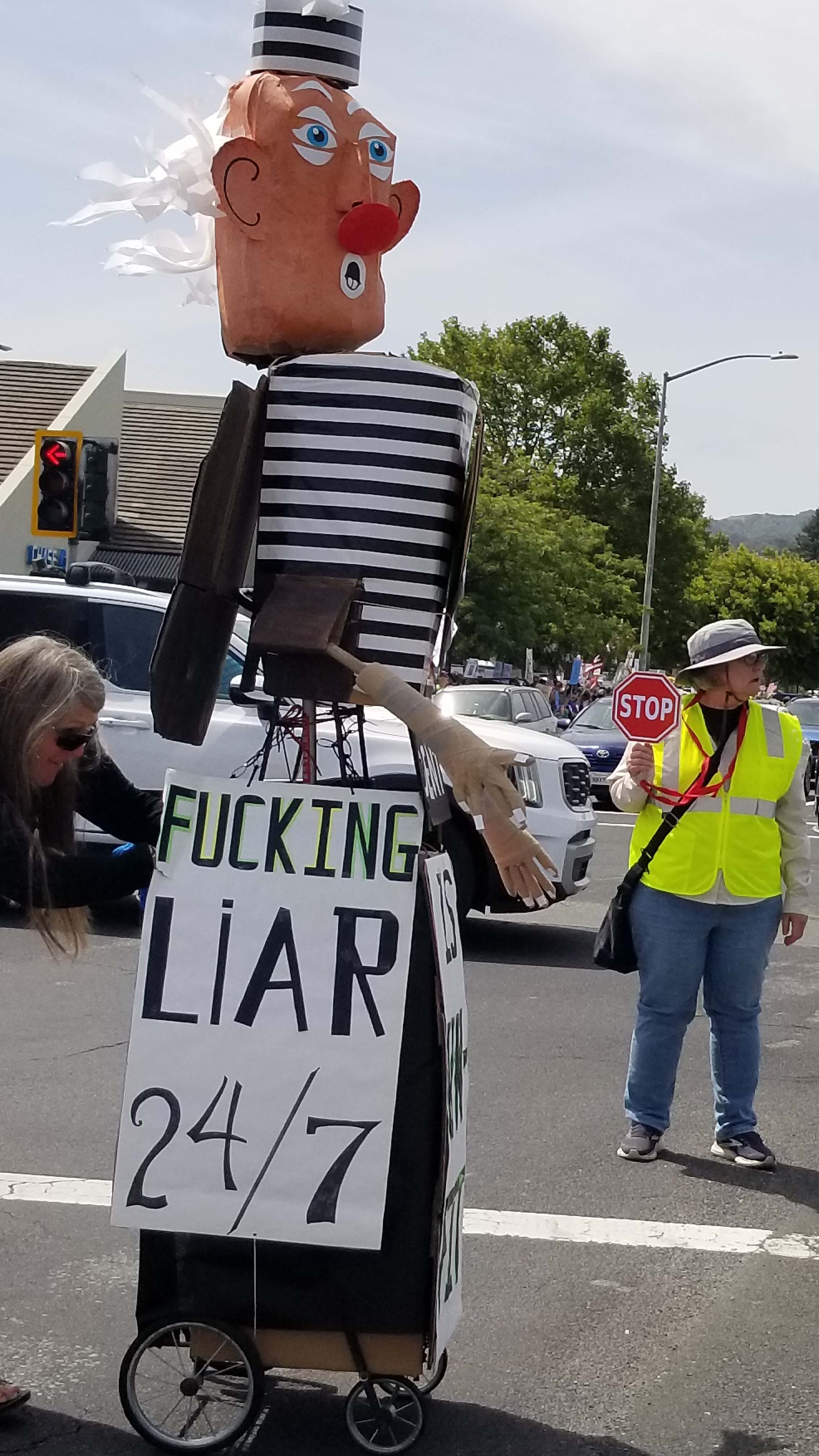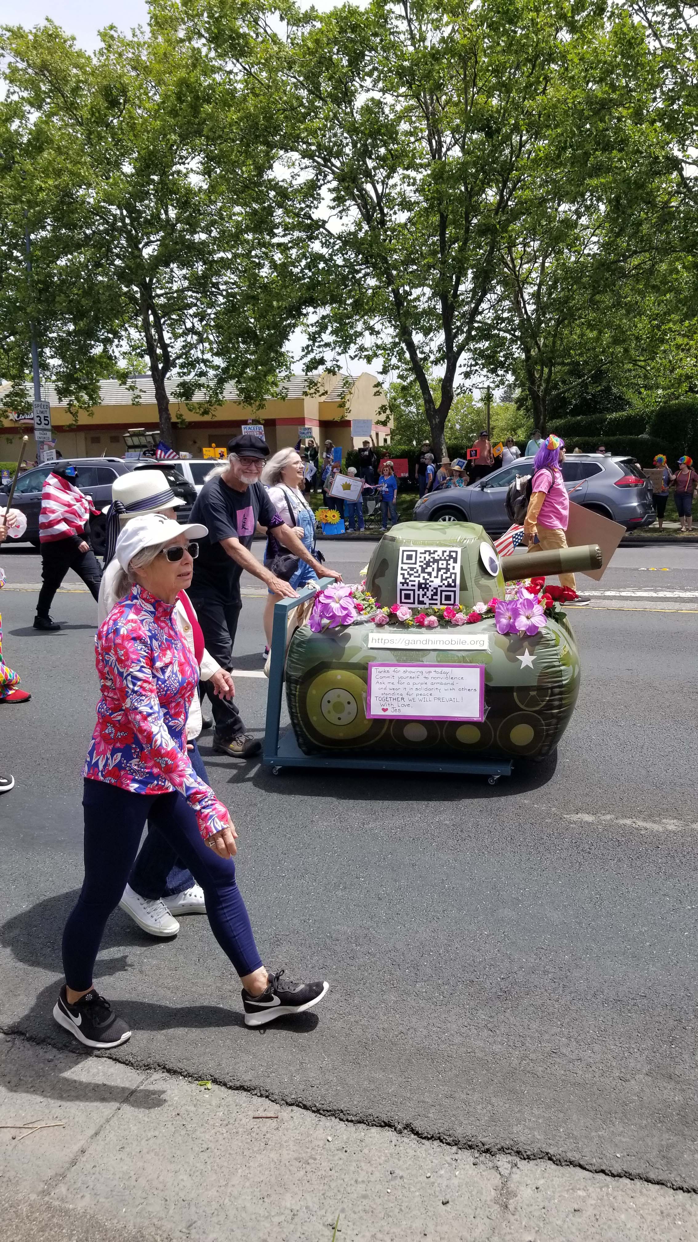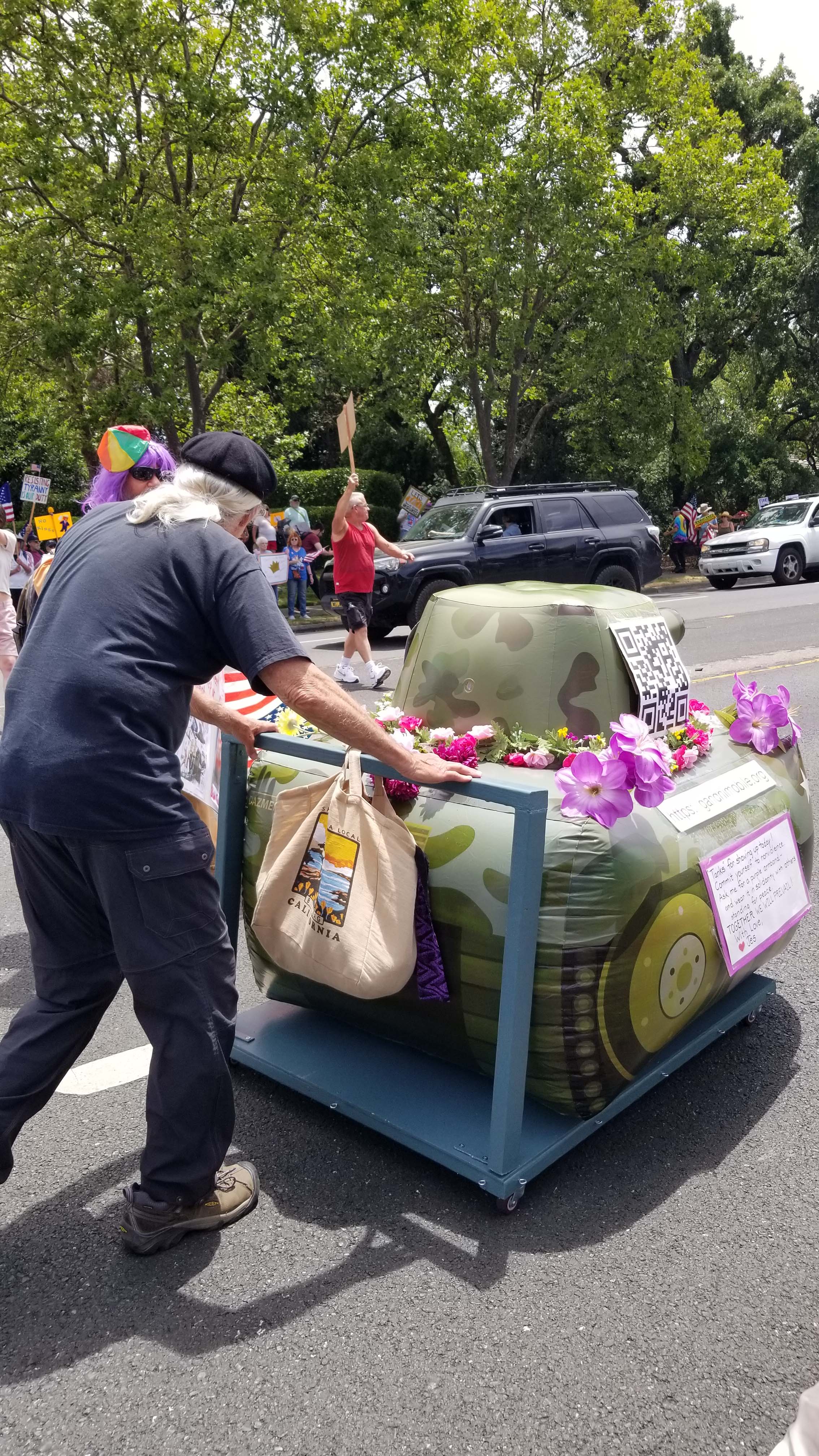 At the back of the marching crowd, a man named Jess from San Rafael was pushing an inflated pool toy shaped like a tank on a cart, poking fun at the military parade in Washington DC happening on the same day as the protests.