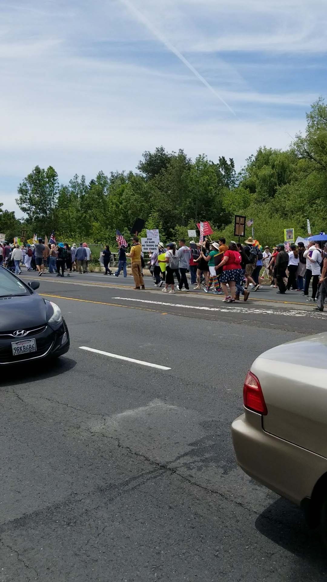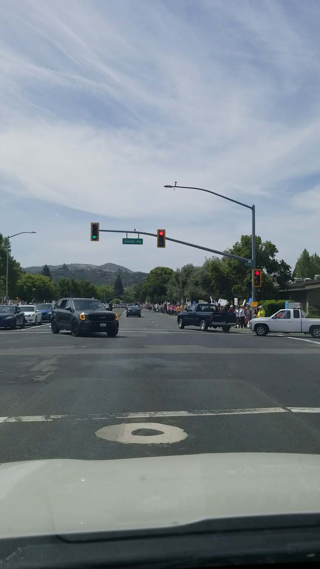 At the Santa Rosa "No KIngs" demonstration, around 12:30, protestors started marching south on Farmers Lane, taking up all of the southbound lanes. Two police vehicles slowly trailed the crowd of people to maintain safety so that cars behind the protestors would not try to drive around or through the group.