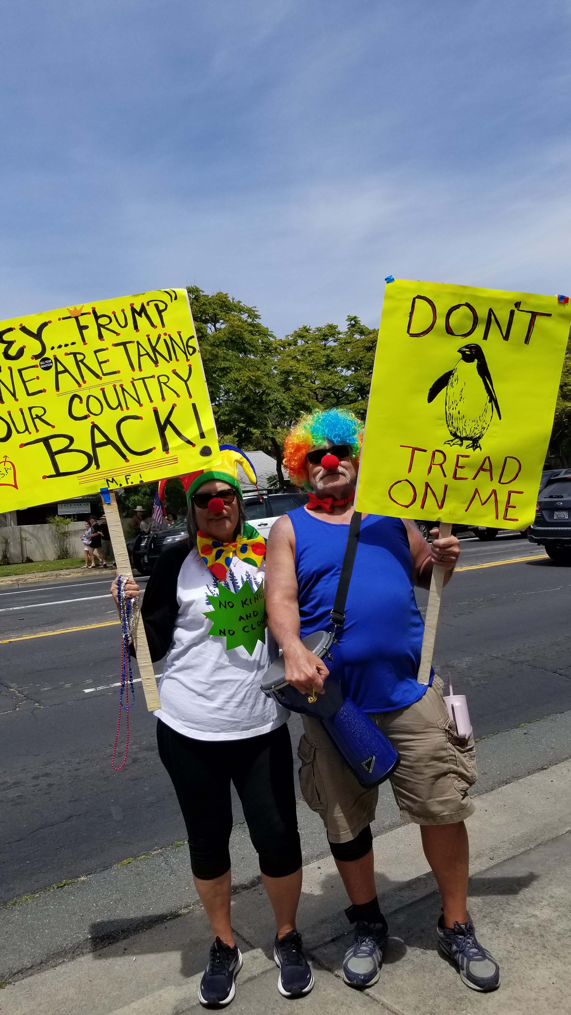 That's Helen and John from Santa Rosa wearing colorful outfits as well as jester hats and rainbow colored wigs. John's sign had a penguin drawn in the middle of it, surrounded by the words, 'Don't tread on me.'