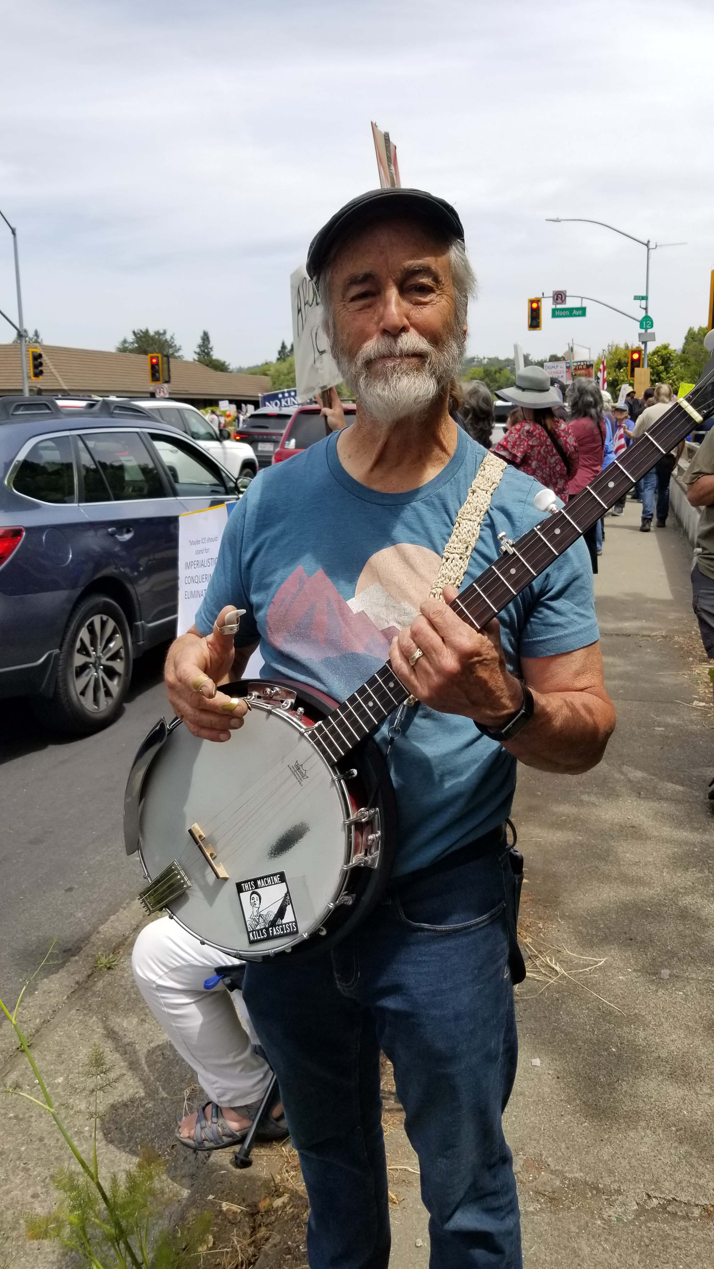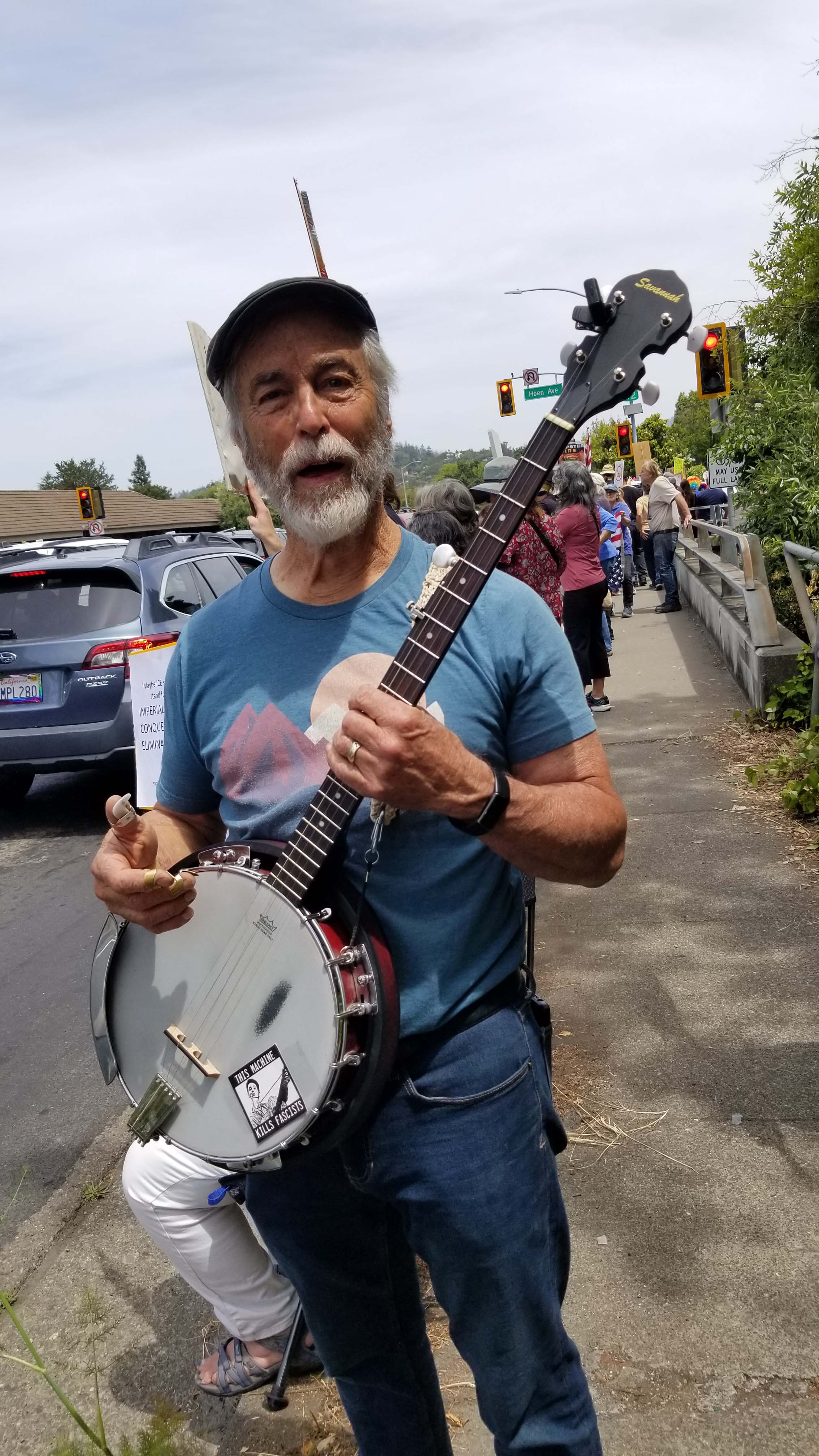A man holding a banjo was asked why he brought this instrument to the protest.