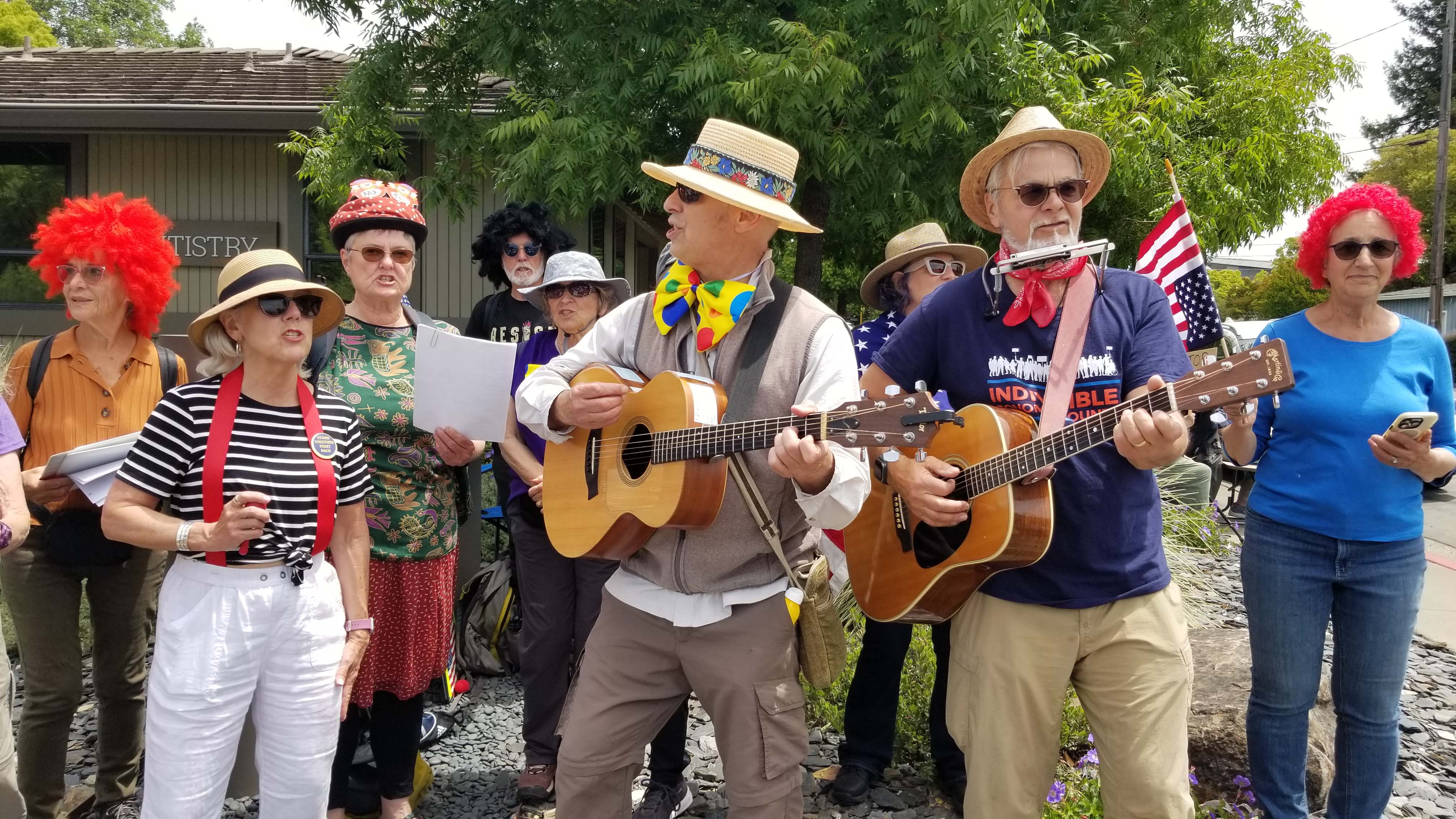 A group of musicians who call themselves Gather With Singers were singing an Italian resistance song, but with new lyrics.