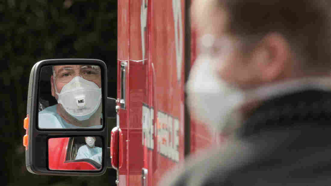 A medic drives an ambulance at the Life Care Center of Kirkland, Wash, which has been linked to most of