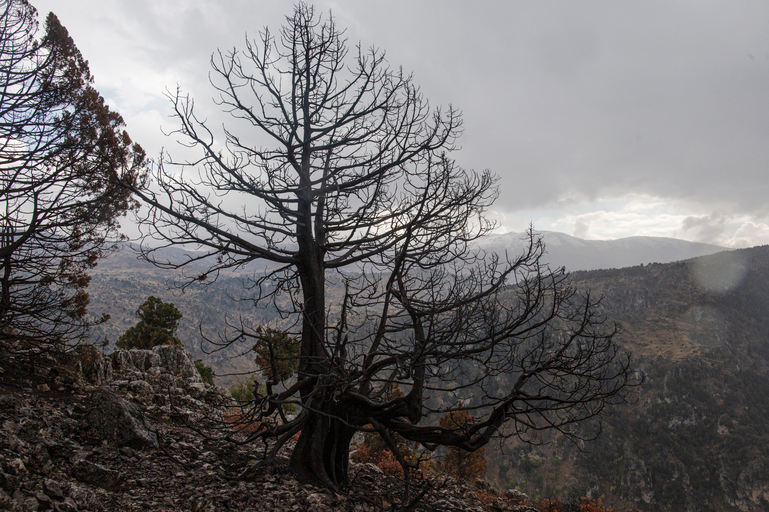 (Photo: A cedar tree that burned in a recent wildfire, in the Mishmish forest, Akkar, Lebanon - Sam Tarling for NPR)